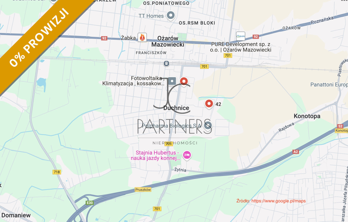 Ożarów, 16 km na zachód od centrum Warszawy, nieopodal węzła autostrady A2 Pruszków, 1 km od granic administracyjnych Warszawy, pomiędzy węzłem autostrady A2 a węzłem DK2.