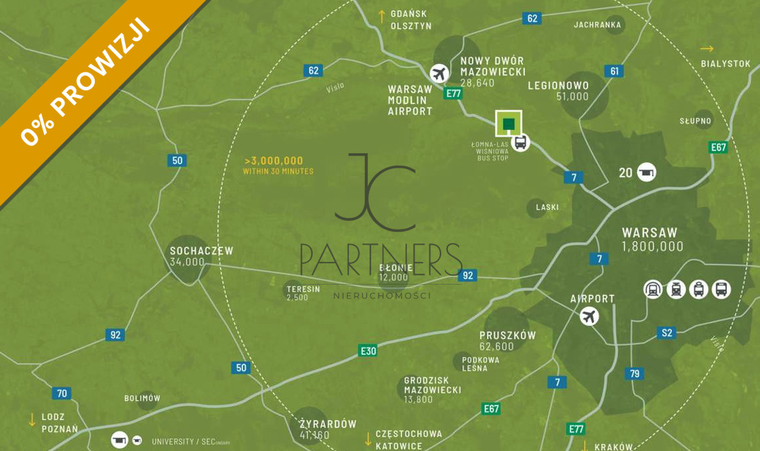 20 km od centrum Warszawy (komunikacja również transportem publicznym), 10 km od lotniska w Modlinie, przy samej S7.