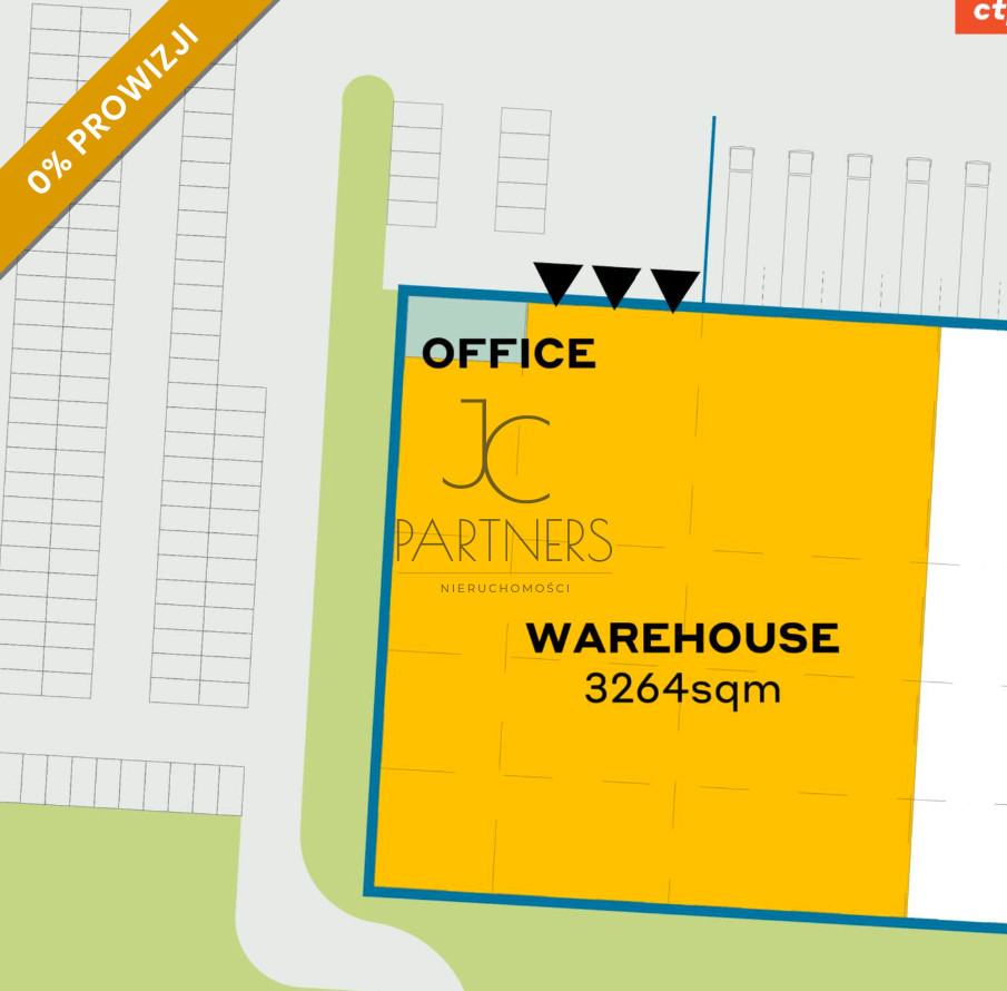 Powierzchnia magazynowa 3264 m2 wraz z powierzchnią socjalno biurową 86 m2.