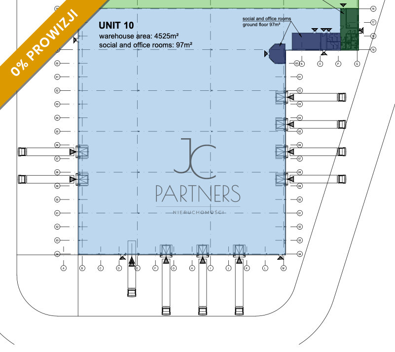 Magazyn o powierzchni 4.525 m2, wysokości 11 m, posiada posadzkę o nośności do 5 t/m2, 6 doków załadunkowych (doki hydrauliczne, możliwość najazdu w przypadku potrzeby bramy "0"), do powierzchni przynależy moduł biurowy o powierzchni ok. 97 m2, wchodzi w skład nowoczesnego parku magazynowo biurowego.