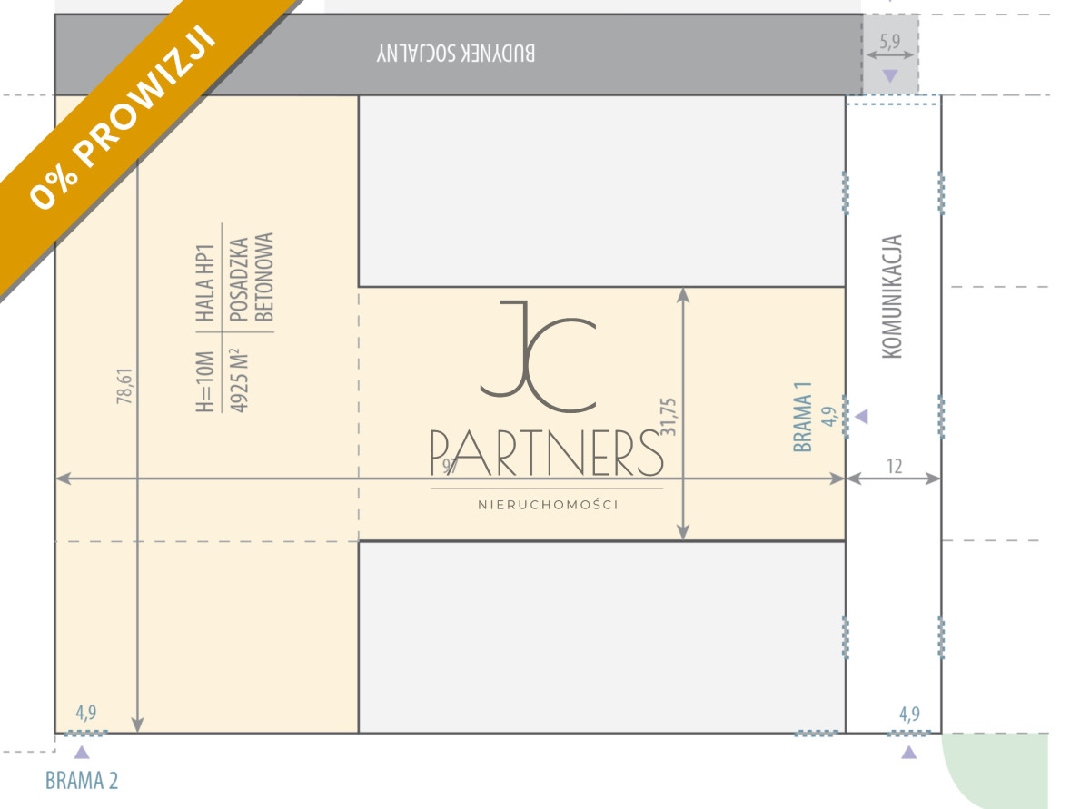 Hala magazynowo produkcyjna 4.925 m2, posiada bramy wjazdowe oraz 3 suwnice sterowane radiowo o udźwigu 2 x 3 T i 1 x 4T, możliwość wynajęcia powierzchni biurowej.