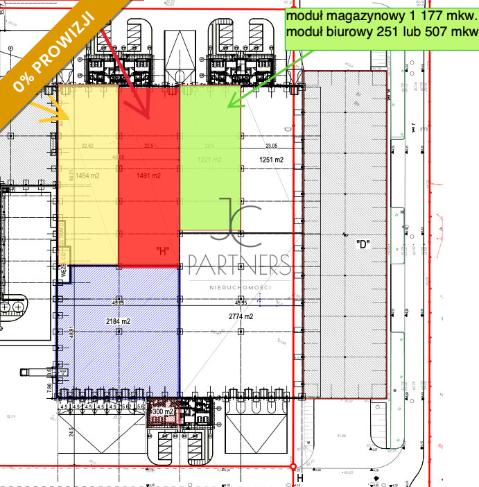 Moduł magazynowy o powierzchni 1430 m2, wysokości 9,5 m, posiada posadzkę o nośności do 5 t/m2, do powierzchni magazynowej istnieje możliwość zaaranżowania biura z pomieszczeniami socjalnymi - wielkość do ustalenia,