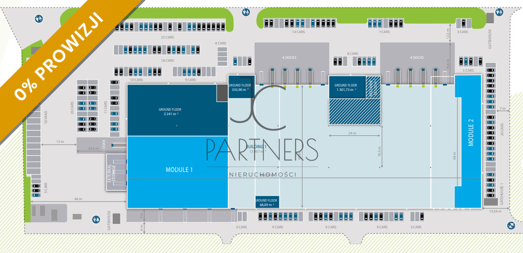 Park oferuje ponad 12 000 m2 powierzchni magazynowych z biurami, rozstaw słupów 24.00 m x 19.50 m, hala posiada głębokość 72 m.