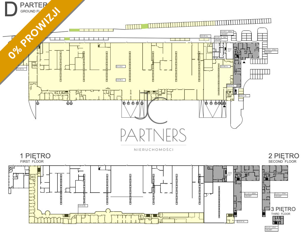 Lokal o powierzchni ok 500 m2 na dwóch poziomach, wysokości 3 m - 4 m, posiada posadzkę o nośności do 3 t/m2, składa się z powierzchni ok 250 m2 na parterze, pod serwis, magazyn, lekką, nieuciążliwą produkcję, (posiada drzwi szer. 130 cm) oraz ok 250 m2 na I piętrze pod biuro lub serwis (rzut w galerii zaznaczony w kolorze czerwonym).