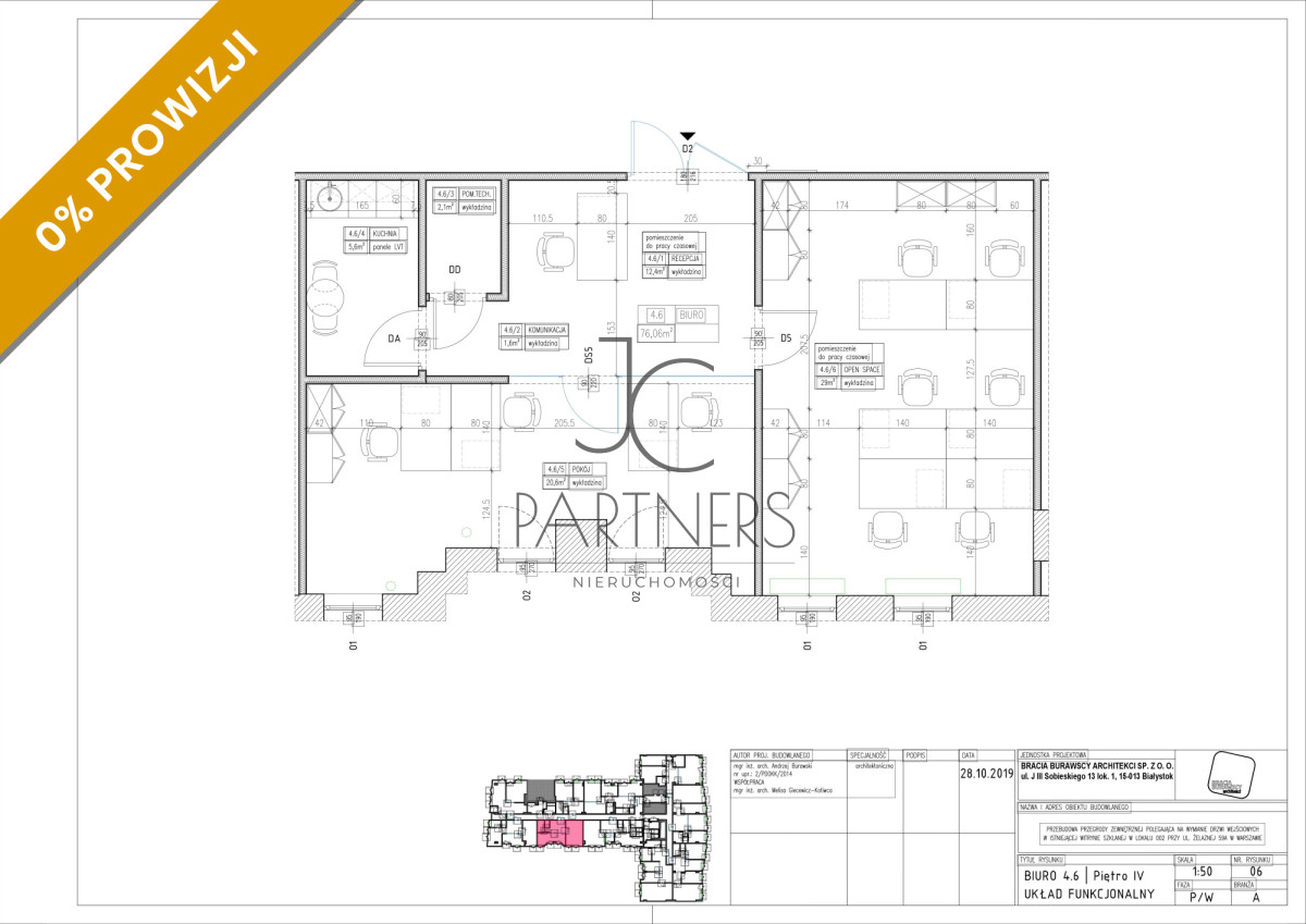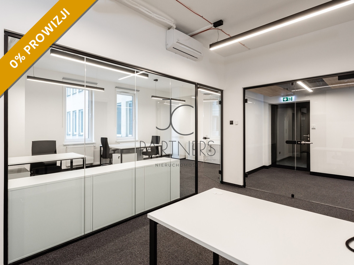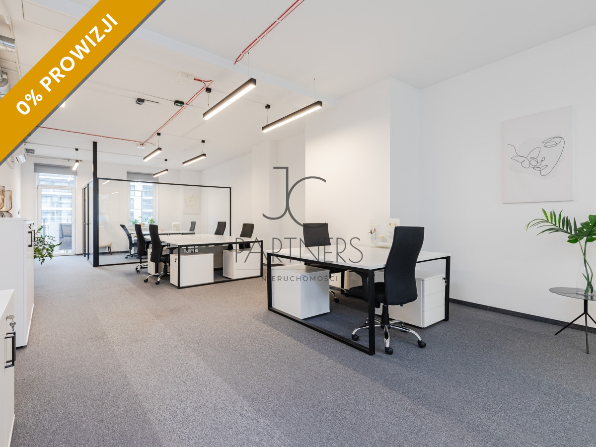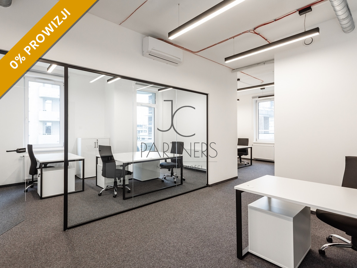 Powierzchnia 76,06 m2 netto (85,95 m2 brutto - zawiera współczynnik powierzchni wspólnych). Umeblowane biuro w układzie gabinetowym, serwerownię oraz mały aneks kuchenny wyposażony w lodówkę, zmywarkę i mikrofalówkę, toalety znajdują się na częściach wspólnych budynku.