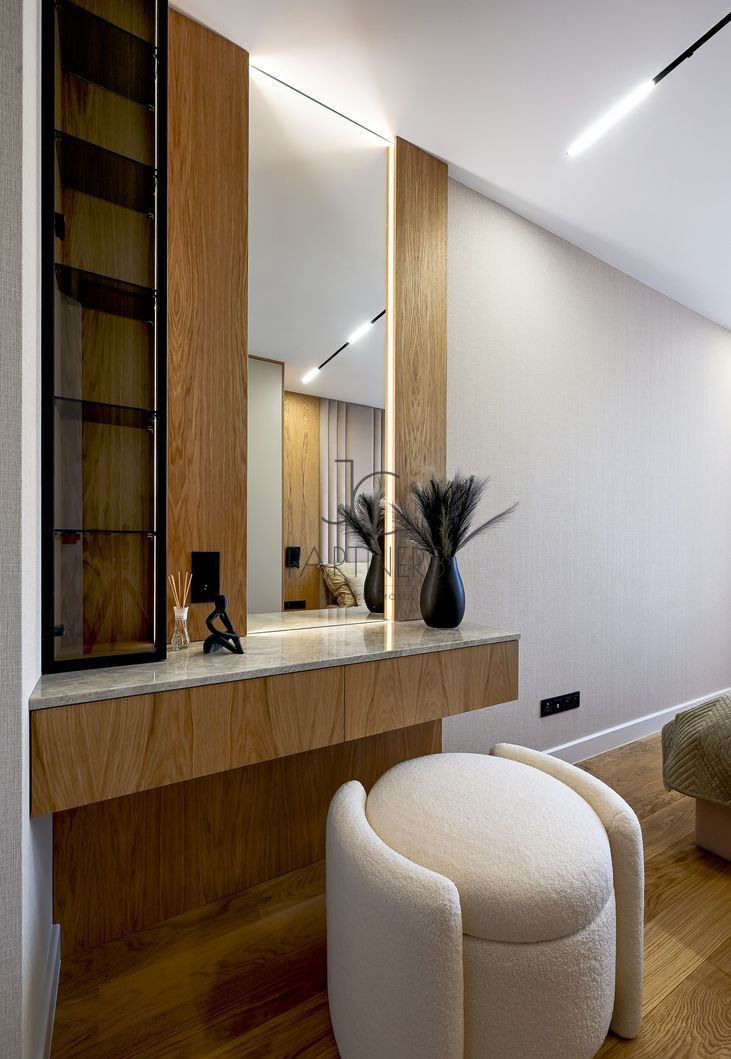 Duża, jasna sypialnia z toaletką i dwiema szafami