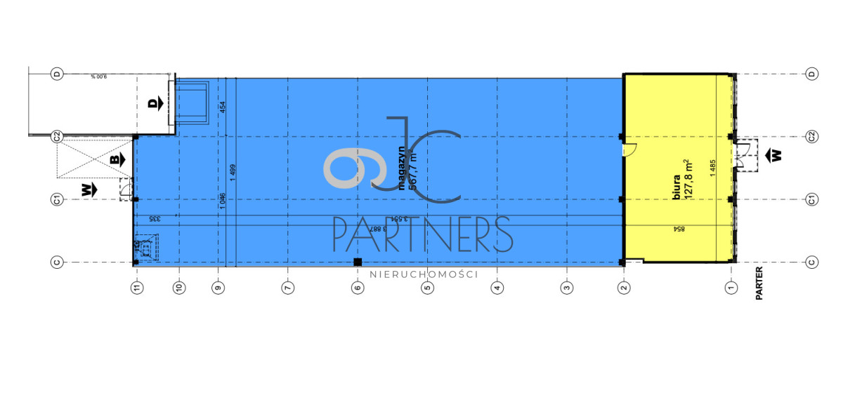 Powierzchnia magazynowa 567,7 m2 wraz z powierzchnią biurową 128 m2.